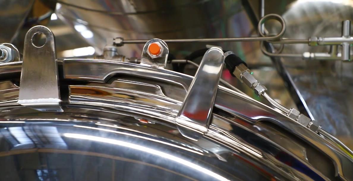 | When the vessel is pressurized, the door quick closure system, composed by several teeth in the door and vessel flanges, ensures that the door cannot be opened manually due to the internal pressure acting on them. Retort/Autoclave should be vented to reduce the internal pressure to atmospheric conditions before the door-securing mechanism can be disengaged.