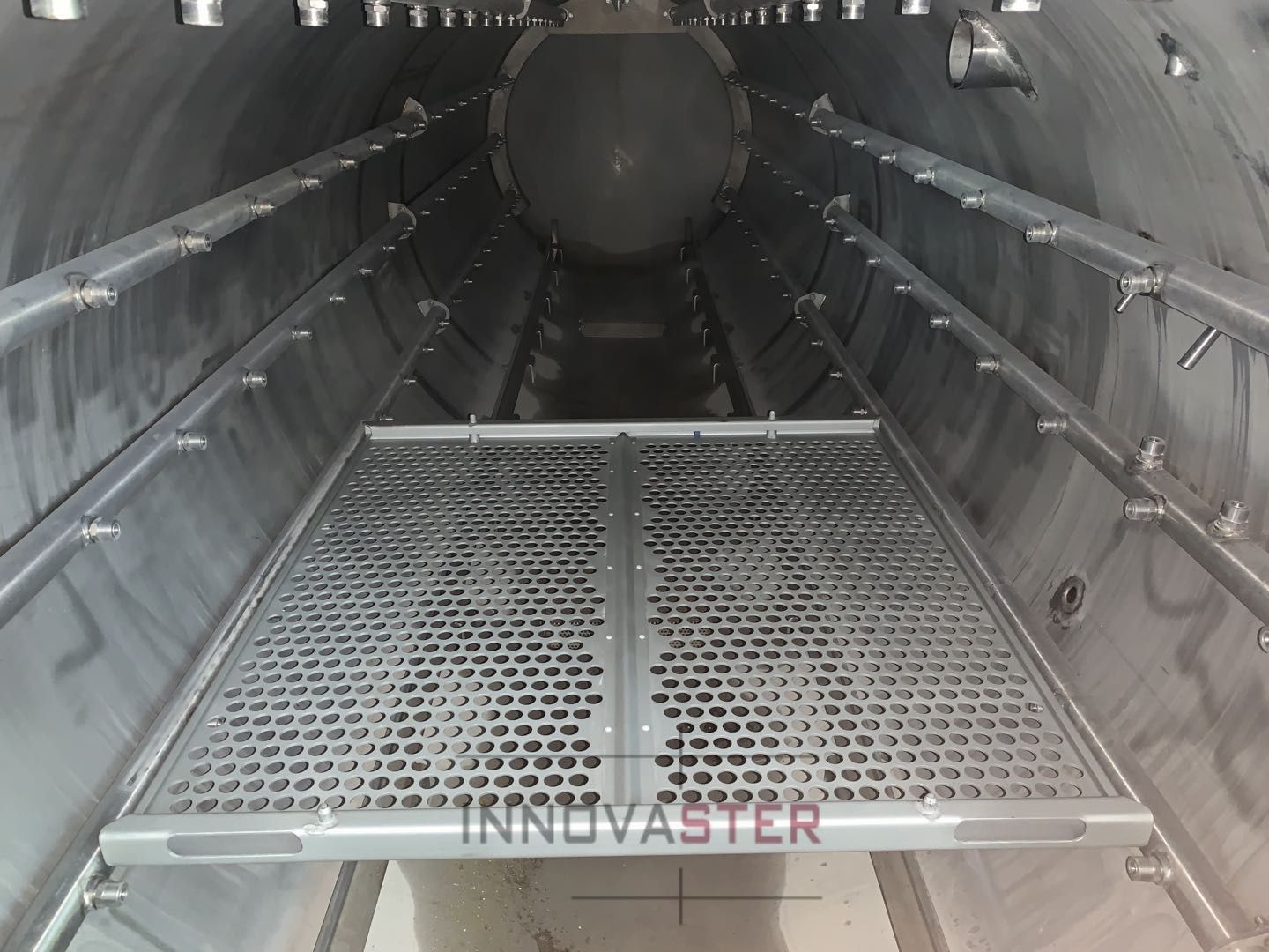 • Water is sprayed over the containers from different angles, steam can go through the other loop of the heat exchanger to heat the process water or directly injected into vessel